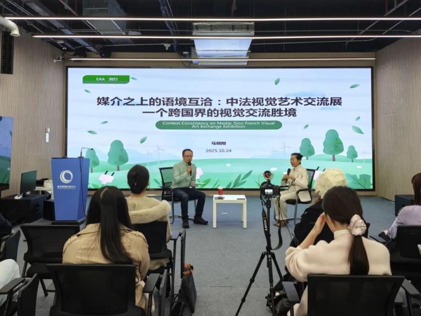 马老师首先给大家分享了一场以“塞纳河左岸和长江右岸”为构思的跨文化艺术展。展览历经一年多筹备,汇聚中法20位艺术家的35件作品,以中法作品并置、虚实结合的展陈方式,融入传统书画数字化、3D打印、AI动画等多元形式,借媒介技术打破文化隔阂,彰显“美美与共、美善相融”的国际合作特质。 在交流讨论环节里,“AI与艺术创作”成为焦点议题,师生们围绕着展览作品展开了深度交流与探讨。